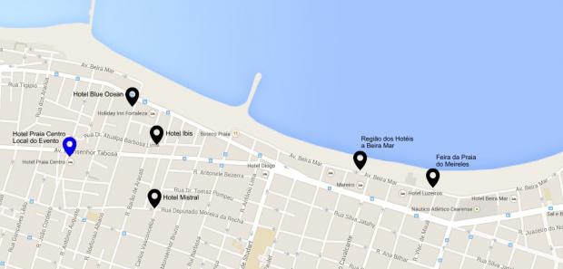 Há várias opções de hoteis e pousadas próximos ao Hotel Praia Centro (menos de 500 m) e também várias opções de hoteis na Av. Beira Mar (aproximadamente 1.5 - 2.5 km do local do evento).